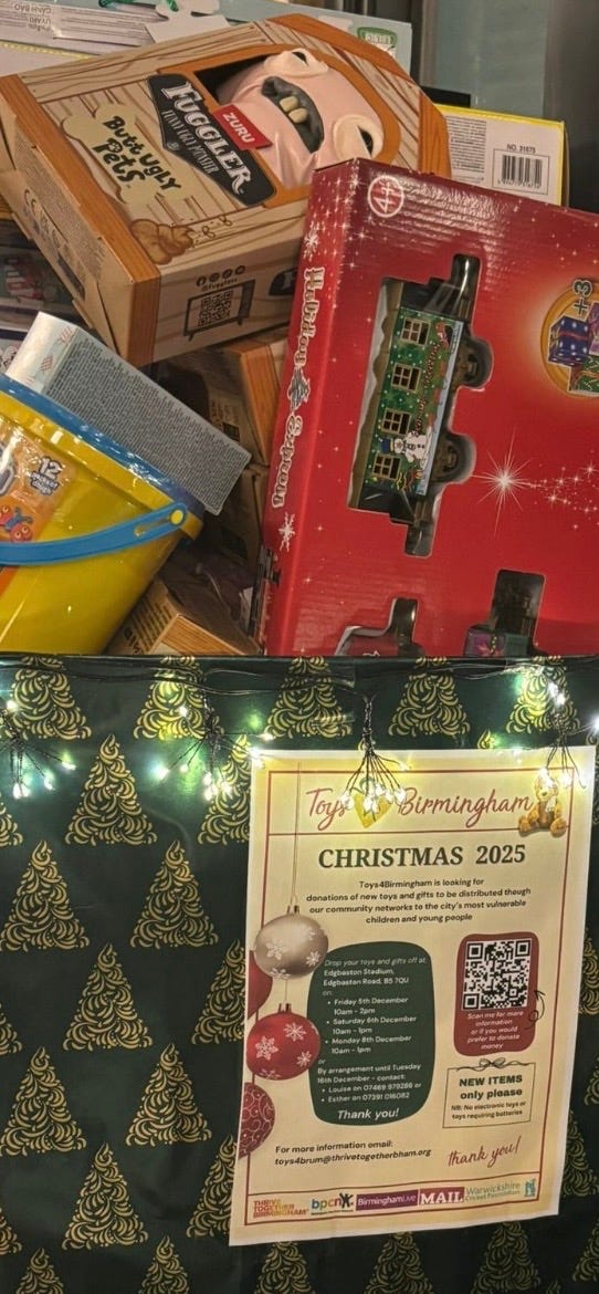 Charitable support has not been limited to cash. On 17 December, staff donated £250 worth of children’s toys to the Toys 4 Birmingham campaign, matching a similar contribution made by customers over recent weeks. The campaign responds to rising demand across the city, with toys distributed through local groups including Brumwish and Thrive Together Birmingham.