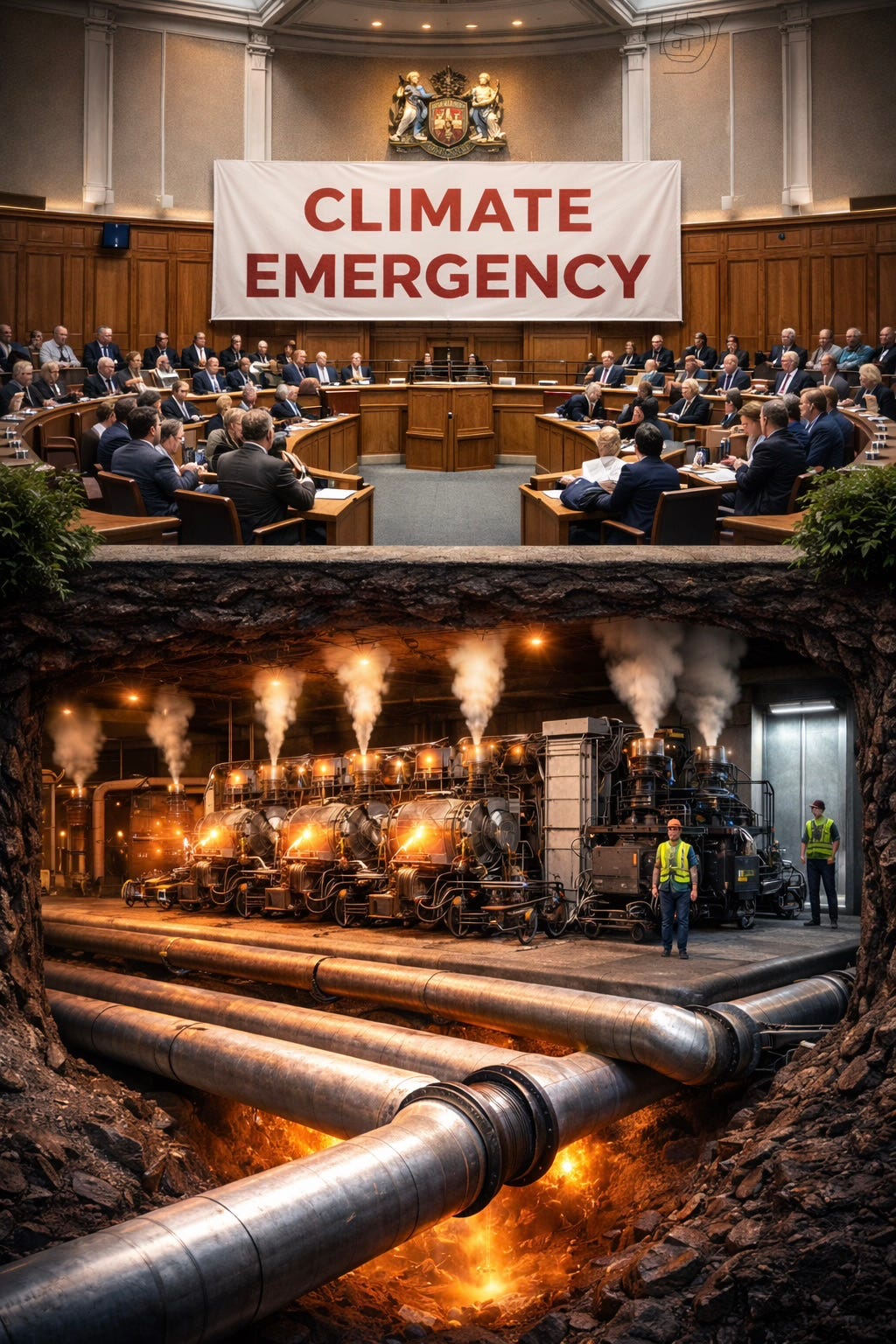 In 2019 Birmingham City Council declared a climate emergency. It required a motion, a vote and a press release. What it did not require was touching the pipes beneath Broad Street. Beneath the city centre runs the Birmingham District Energy Company network, a central heating system that delivers more than 60 million kilowatt hours of heat each year through over twelve kilometres of buried insulated pipework. The council declared an emergency. The pipes kept working exactly as they had the day before.