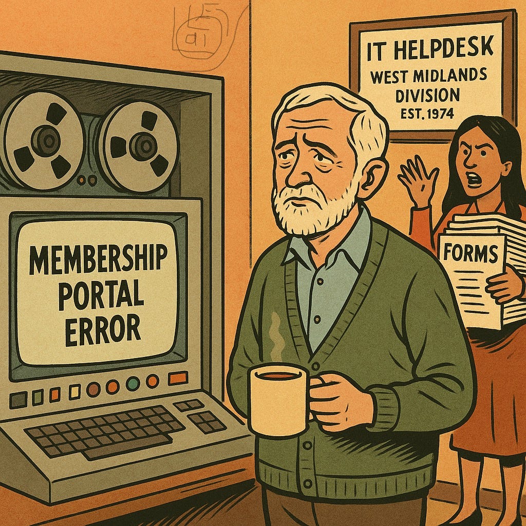 Jeremy Corbyn urges supporters to “move on” after a botched membership launch — while Zarah Sultana fumes and the Midlands wonders what it’s all for.