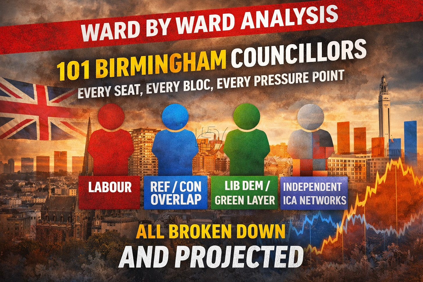 An exclusive ward by ward projection of Birmingham’s 2026 local elections. Reform rises, Labour weakens, and across 101 seats the numbers point to one outcome, not control, but negotiation.