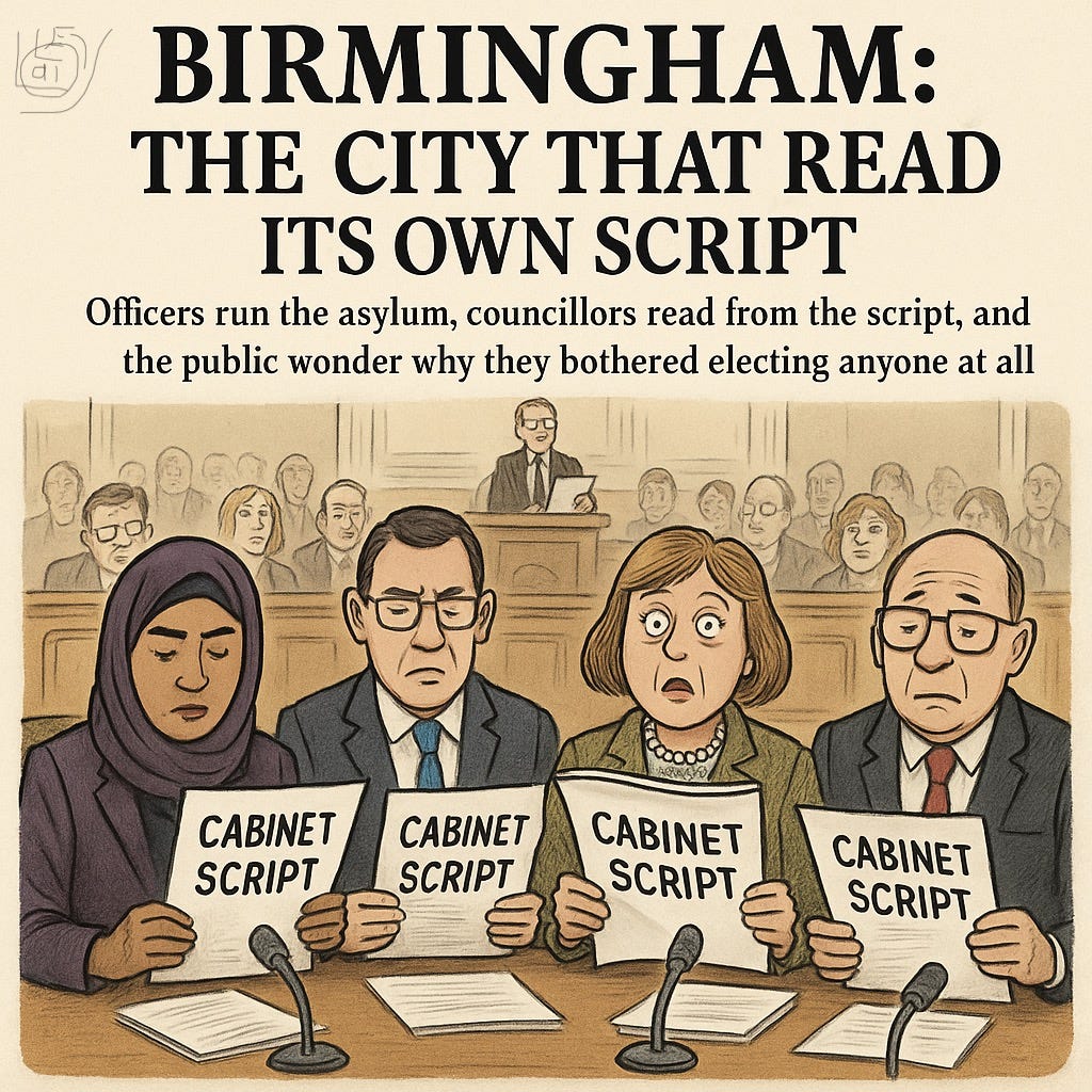 If you ever want to understand why local government feels broken across Britain, start in Birmingham. What unfolds in this chamber is not unique; it is simply a more polished version of the same civic pantomime being played out in town halls across the land. Officers run the asylum, councillors read from the script, and the public wonder why they bothered electing anyone at all.