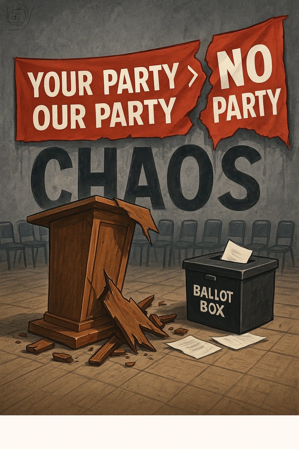 So what do we have? A party without policies, without a functioning membership system, now split into Your Party and Our Party. Rows about money, accusations without evidence, activists with baggage demanding control, and a co-founder who denies everything and threatens legal action.